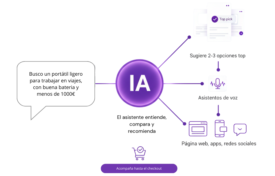 El asistente entiende la intención, filtra el catálogo, sugiere 2–3 opciones top, explica pros y contras y, si hace falta, propone alternativas. Es como tener un “personal shopper” digital que acompaña hasta el checkout.