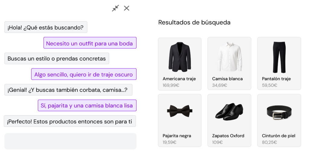 Si la búsqueda es amplia, nuestro chat preguntará por ocasión, fit o talla y afinamos la selección en segundos.
