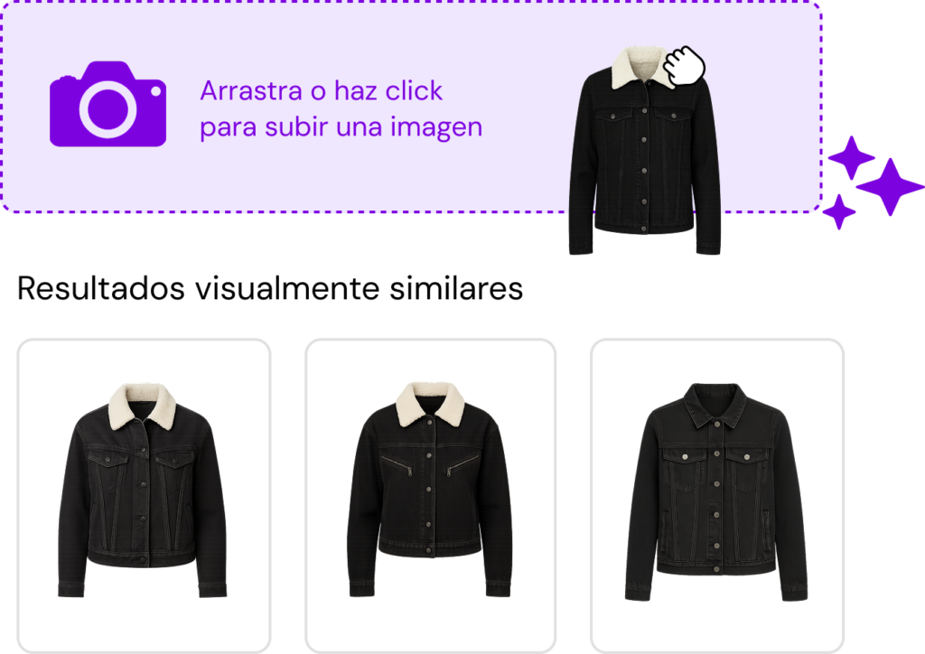 Sube una foto y encuentra prendas visualmente similares por corte, tejido y color. De la inspiración a la compra.