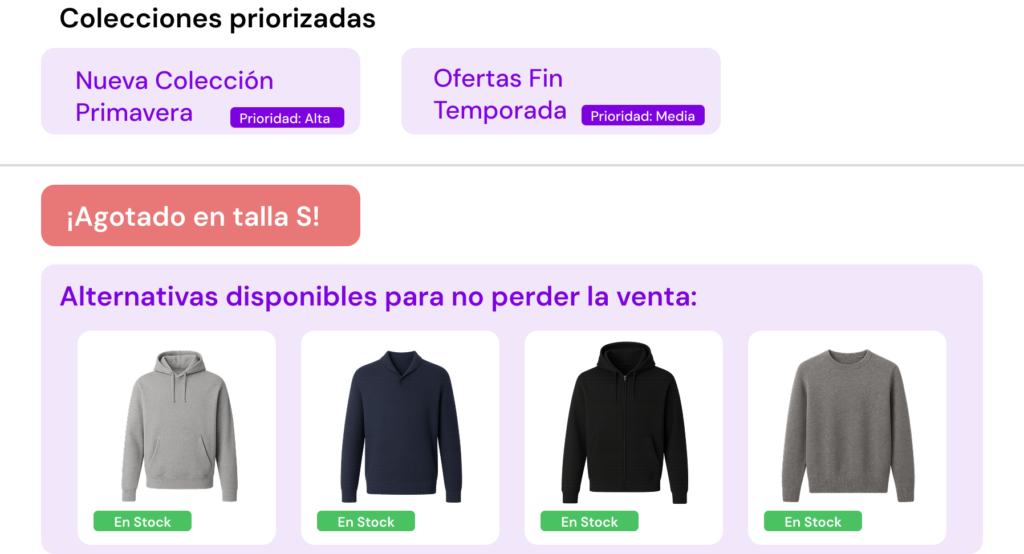 Prioriza colecciones o márgenes sin perder relevancia. Si no hay talla/color, propón alternativas para no perder la venta.